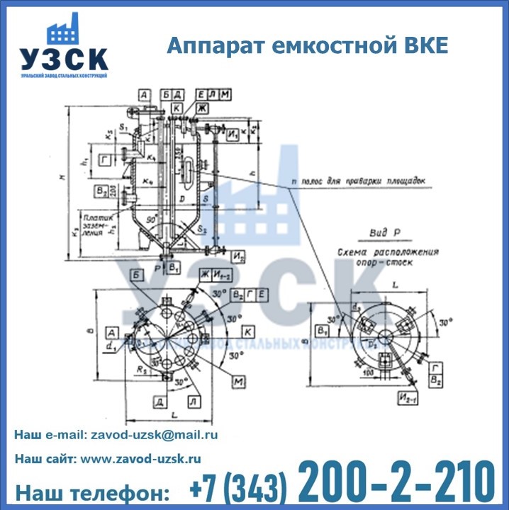 Емкостные аппараты ВКЭ представляют емкость с эллиптической крышей и коническим днищем. аппарат может использоваться в Тамбове для приема и хранения жидкостей и взрыво- и пожароопасных веществ. Создаваемое давление не должно превышать 0,6; 1,0 МПа. Емкости ВКЭ выполняются как цельносварные. Используется марка стали, отвечающая степени агрессивности продукта и температуре эксплуатации.